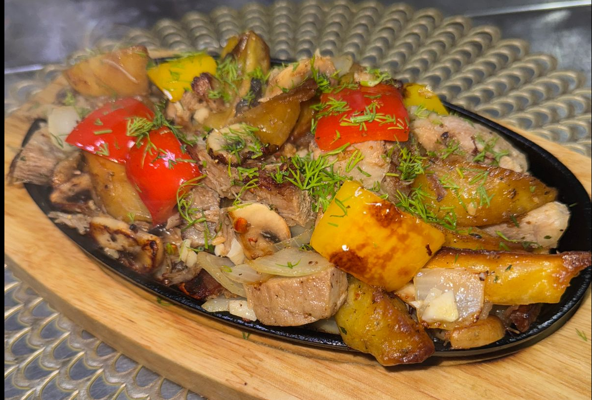 Подается на шипящей порционной сковородке. Баклажан, перец сладкий, лук, шампиньоны, картофель. На ваш выбор: